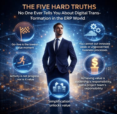 Most ERP and digital transformations don’t fail because of technology—they stall because leaders mistake delivery for value. This article challenges five uncomfortable truths that explain why value is often lowest at go-live, why activity isn’t progress, and why complexity quietly erodes ROI. It reframes ERP transformation as a leadership discipline, not a project milestone, and sets the stage for building value that actually compounds over time.