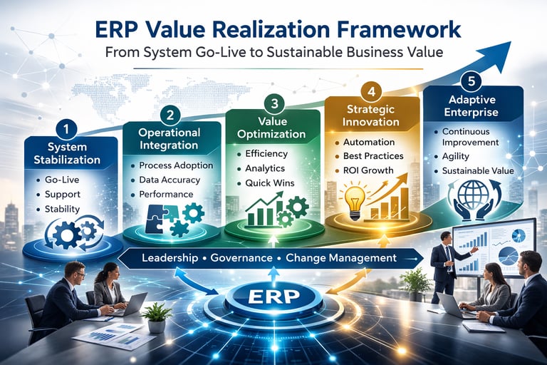 The article “Value Realization Framework: A Practical Model for ERP Leadership” explains that going live with an ERP system is just the beginning, and real organizational value comes from progressing through five maturity phases—from stabilizing the system to building adaptive enterprise capabilities. It presents a practical leadership model that helps leaders diagnose where value stalls, understand why it happens, and identify the leadership behaviors needed to drive sustained business outcomes from ERP investments.